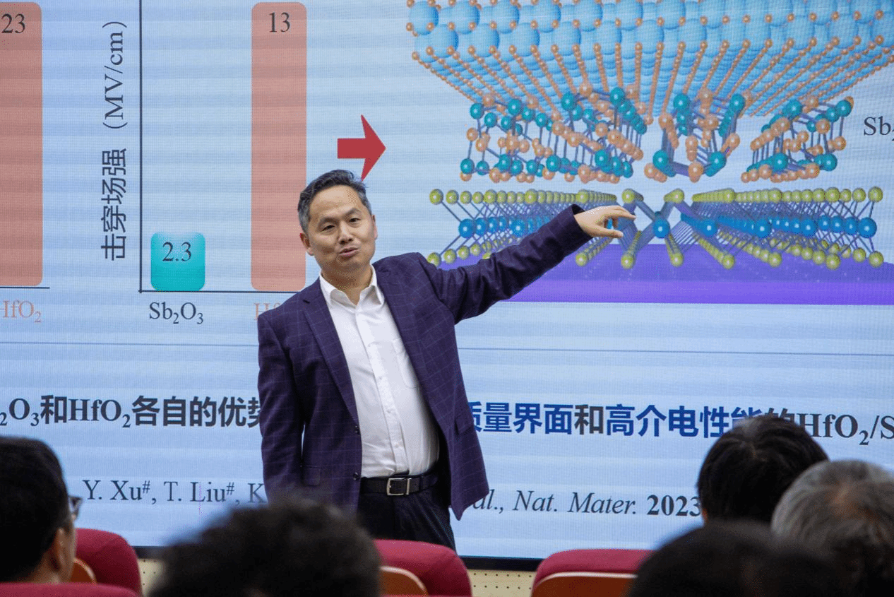 在“新应用”环节,翟教授讲述了氧化锑(Sb₂O₃)在器件领域的实践探索。团队利用该类晶体的结构特性,开发出高性能介电层材料,通过热蒸镀法制备晶圆级薄膜,有效减少载流子界面散射,使二维晶体管的迁移率显著提升、操作电压大幅降低;此外,该材料还可作为封装层,在保护易氧化材料稳定性方面表现突出,同时在离子迁移、数据存储等组变材料场景中也展现出应用潜力,目前已与合作实验室成功制备出 8 英寸相关器件。