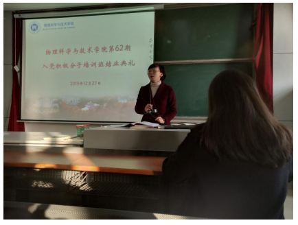 2019年12月27日下午,物理科学与技术学院第62期入党积极分子培训班结业典礼在9号楼12楼报告厅顺利举行。物理学院党委副书记马英、入党积极分子培训班带队老师王惠娟出席结业典礼,物理学院第62期入党积极分子90余人参加了结业典礼,本次结业典礼由王惠娟主持。