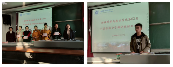 随后王惠娟宣布了培训班结业名单、优秀学员、优秀小组名单,由马英为同学们颁发了证书,并表达了对他们的祝贺。优秀学员代表徐虎同学发表讲话,表达了对老师及同学的感谢,同时表示自己会以身作则,继续努力,争取早日入党。