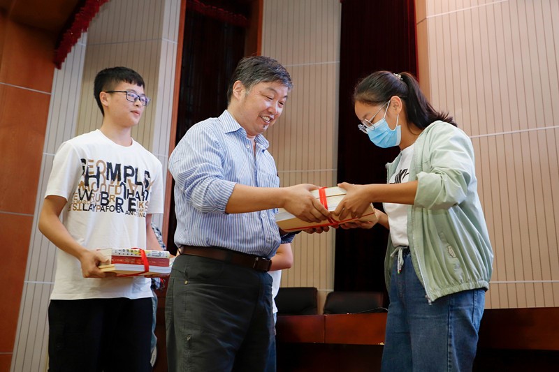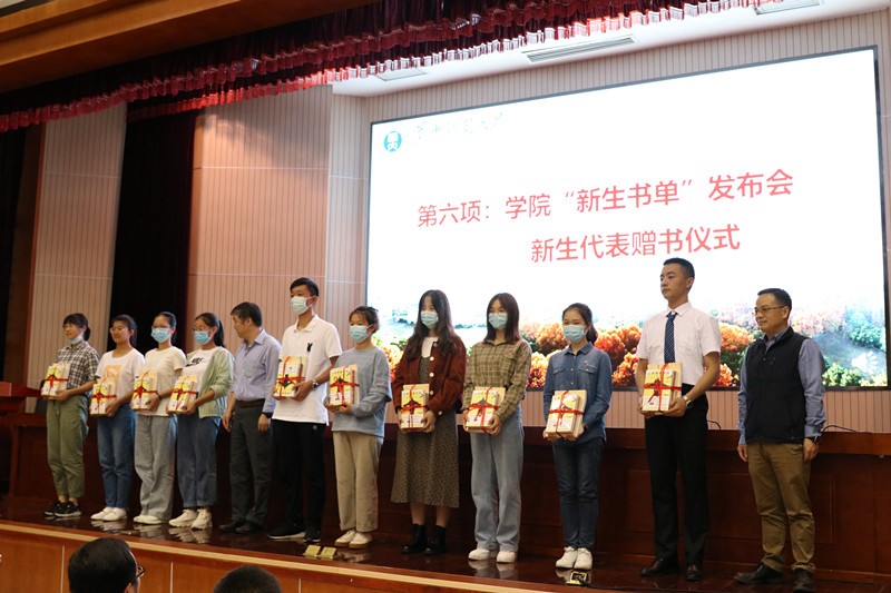 为培养新生好读书的学习习惯,在新生中营造读好书的良好氛围,典礼特别策划并组织“新生书单”发布会和赠书仪式。此前,学院全体教职工积极响应好书推荐活动,经精心推荐出来的书目被印制成精美的“新生书单”下发给到场的每一名新同学,旨在激励新生在未来四年的大学生活中通过阅读经典书籍开阔视野、明确志向、陶冶情操、滋养心灵。黄光明教授、俞云伟教授为新生代表赠书。