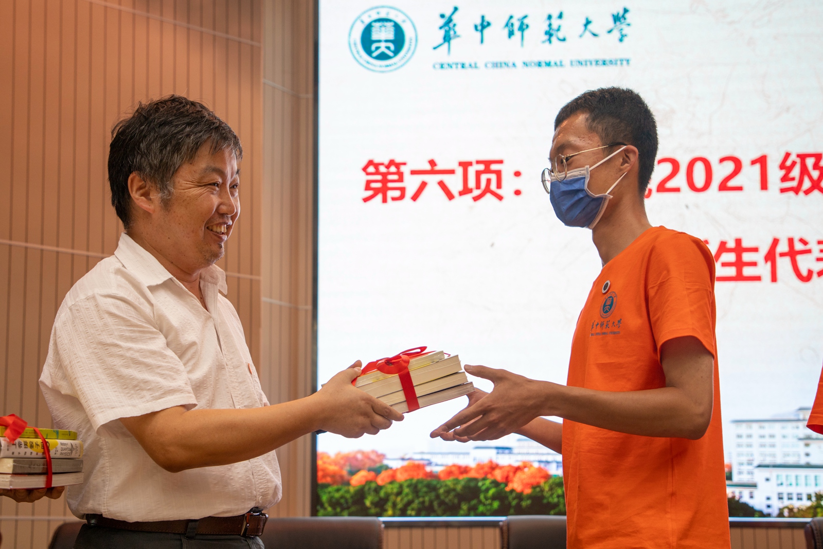 为营造优良学风,培养新生爱读书读好书的学习习惯,典礼特别策划并组织“新生书单”发布会和赠书仪式。新生报到之前,学院团委在全体教职工中开展了第二届向新生推荐好书的活动。老师们踊跃参与推荐,印制精美的“新生书单”是学院送给新同学的第一份“见面礼”。黄光明教授、俞云伟教授为新生代表赠书。