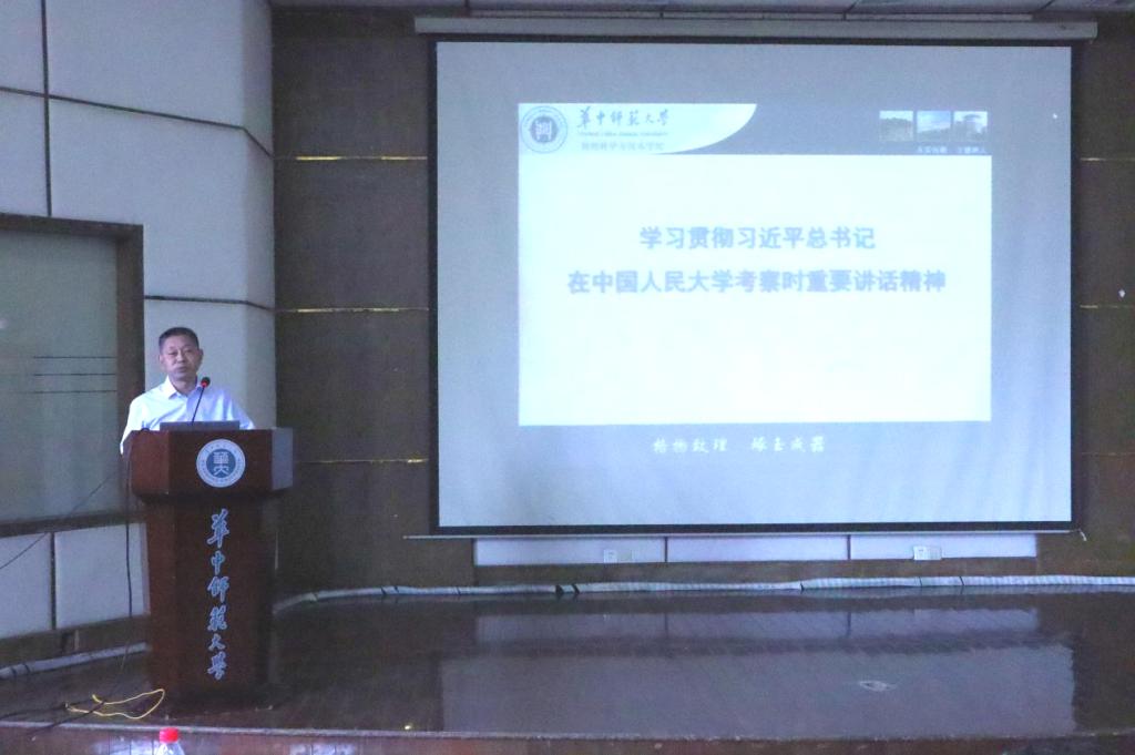 张明生带领教职工集中学习了习近平总书记在中国人民大学考察时的讲话内容,特别强调了其中关于高校建设和教师队伍的部分。张明生表示,习近平总书记寄语广大教师“要立志成为大先生,在教书育人和科研创新上不断创造新业绩”,学院全体教职工要认识到自己担当的责任和使命,做学生为学、为事、为人的示范,努力成为精于“传道授业解惑”的“经师”和“人师”的统一者。张明生鼓励大家要深入落实习近平总书记的重要讲话精神,做”有理想信念、有道德情操、有扎实学识、有仁爱之心“的四有好老师。