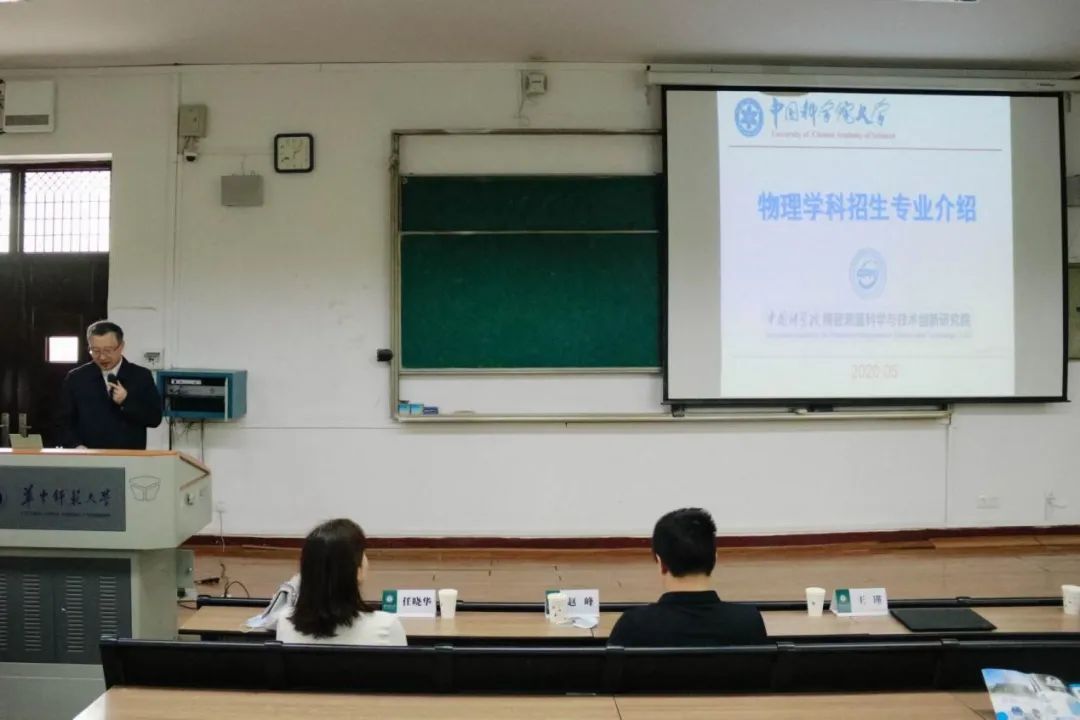 (通讯员 洪非儿)2022年5月13日下午,中国科学院精密测量科学与技术创新研究院(以下简称“精测院”)于7202教室为我院本科生开展招生宣传讲座。精测院研究员高克林、王谨、赵峰,研究生处处长任晓华、赵行双参加活动。
