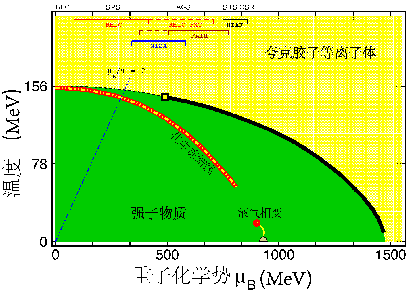 图1:QCD相图,纵坐标为温度T,横坐标为重子化学势µB。黑色实线为一级相变边界。正方形框标示了可能的QCD临界点位置。红色点代表普通核物质的液气相变临界点。相图的顶部标出了不同重离子碰撞实验的相图覆盖范围。