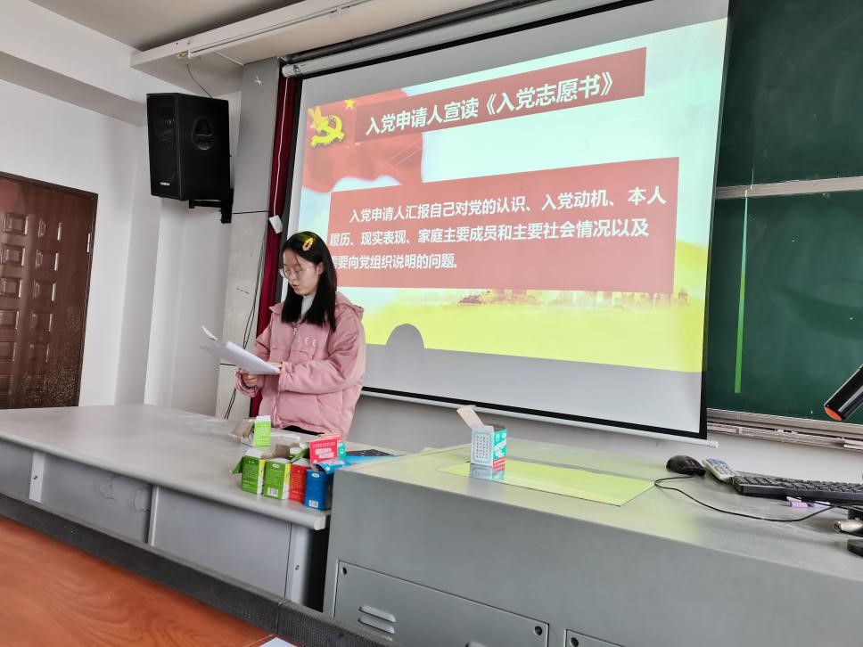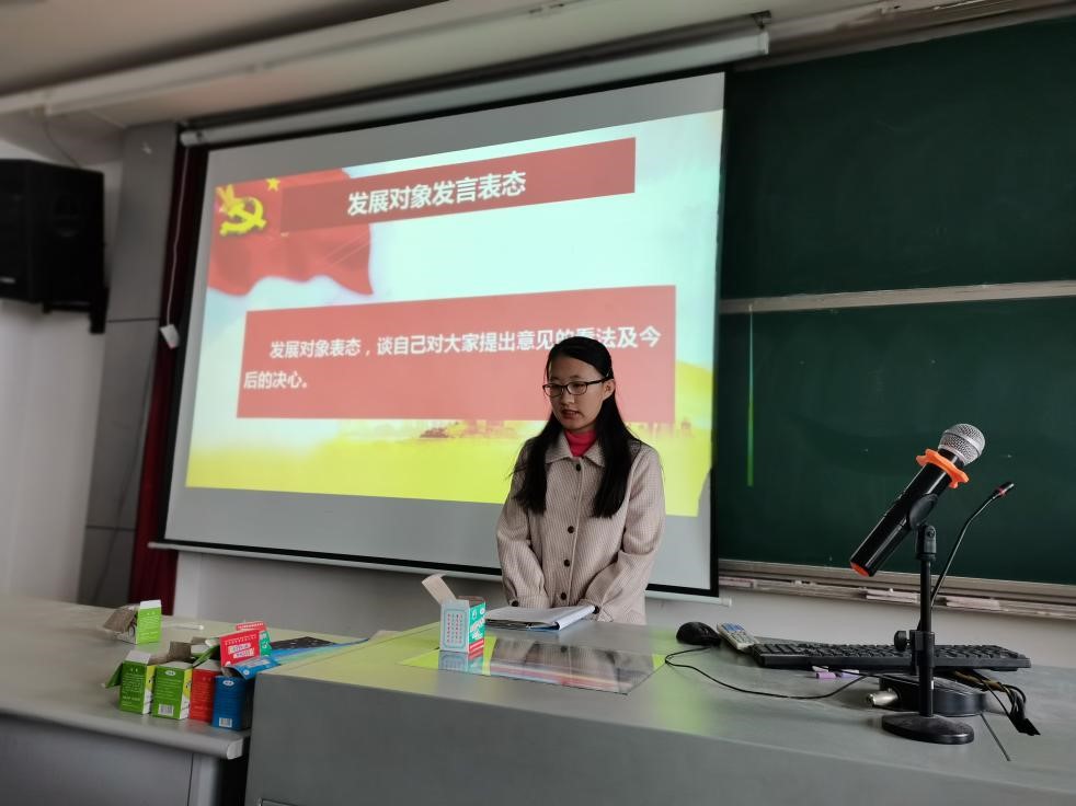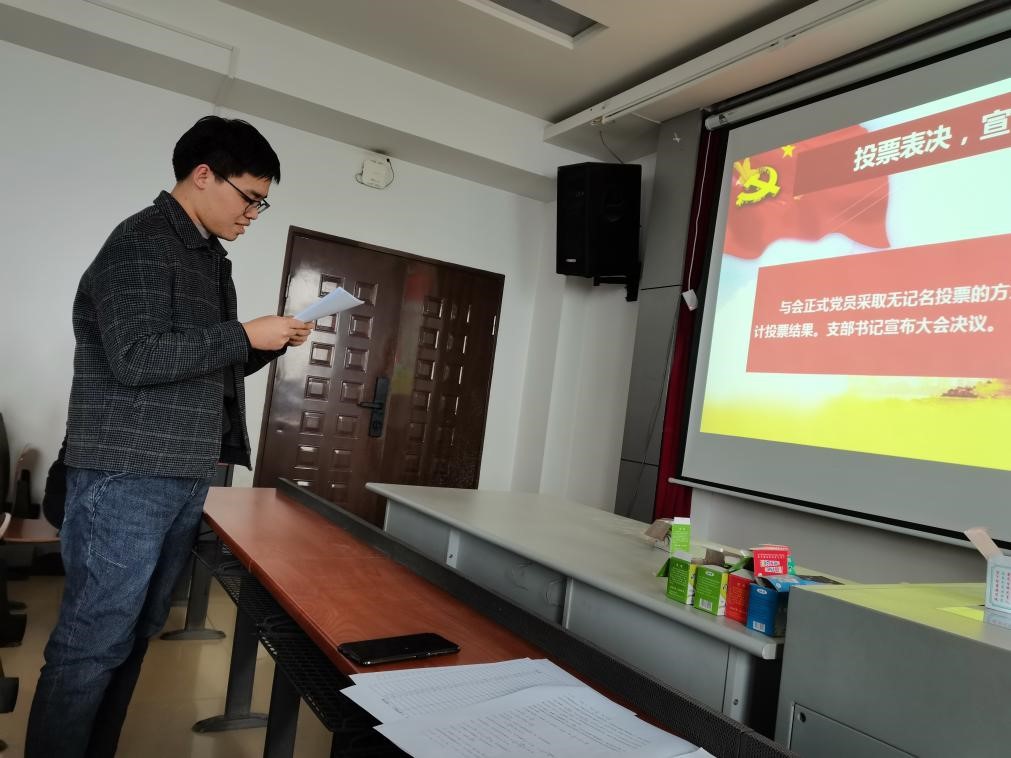 会议伊始,支部副书记张文杰介绍本次大会的主要内容。根据大会议程,会议首先由全体参会同志起立齐唱国歌,再由发展对象依次宣读入党志愿,汇报自己对党的认识,陈述入党动机及自身表现,主要优缺点及需向党组织说明的有关问题。随后由入党介绍人根据对发展对象的了解,总结各发展对象的表现,说明对申请人的介绍理由和考察情况,表明了自己的意见。最后经支部党员充分讨论,以正式党员无记名投票方式对发展对象进行投票并现场逐一公布投票结果。最终,敖瑶等29名发展对象得到支部大会的一致认可,物理科学与技术学院本科生师范专业党支部决定正式接收他们为中共预备党员。