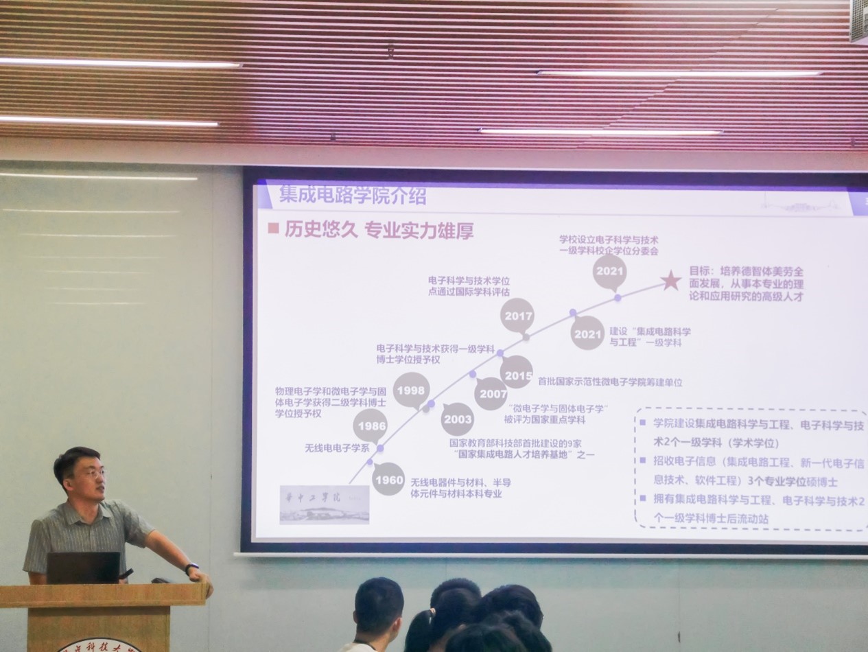 在交流环节,华中科技大学集成电路学院专职辅导员、本科生党建工作专员刘文乐为在场师生介绍了学院在学科建设、师资力量、人才培养和就业质量等方面的优势和成果。他强调,学院拥有突出的学科优势和科研实力,致力于培养具有创新精神和实践能力的高素质人才,为国家集成电路产业的发展做出积极贡献。