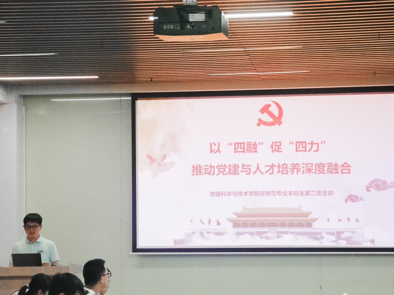 学院非师范专业本科生第二党支部王益明同志作《以“四融”促“四力”,推动党建与人才培养深度融合》工作汇报,通过生动的数据和案例展示了支部充分发挥党组织战斗堡垒作用和党员先锋模范带头作用,把育人为本作为自身战略选择,促进党建与人才培养深度融合,进一步提升学生党支部引领力、凝聚力、组织力、驱动力的实践路径。