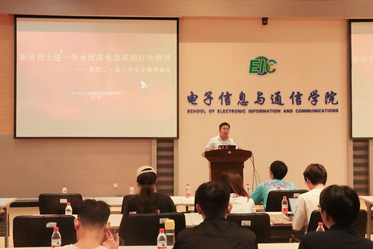 随后,两支部成员于会议室共同学习。首先,赵广超老师通过生动的数据和案例对学院学科建设与人才培养体系进行了分享,重点介绍了学院师资队伍建设情况及主要研究方向,为有意愿来院深造的学生提供指导。支部成员聚精会神,对华中科技大学电信学院有了更深入的了解,研究兴趣被激发,学术视野得到拓展。
