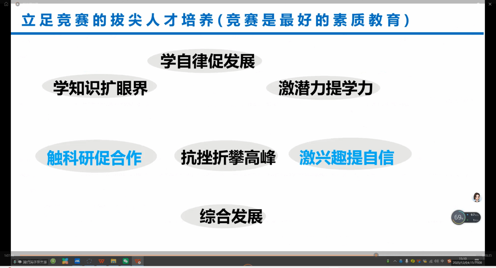 浦老师进行简短的自我介绍后,围绕三大主题展开阐述:新时代教师面临的挑战、教师专业发展的路径与实践思考、拔尖创新人才培养的实践探索。