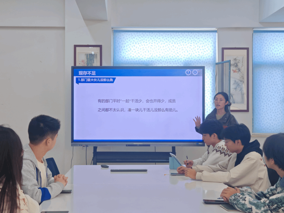 学院团委学生副书记孙盈盈就近期团学工作进行系统总结。她肯定了前期工作任务分配灵活、部门对接细致、工作留痕扎实、时间安排科学等亮点,同时明确指出当前工作中存在三方面亟待改进的问题:部门成员间的配合协作尚显不足,部分成员的担当意识和主动性有待加强,对关键规章制度如考评条例的理解仍需深化。针对上述问题,她围绕组织建设与能力建设两大方向提出改进要求,明确将通过组织跨部门交流活动、加强规章制度宣讲解读、营造勤学善问的团队氛围等系列措施,全面提升团学工作效能和团队凝聚力。