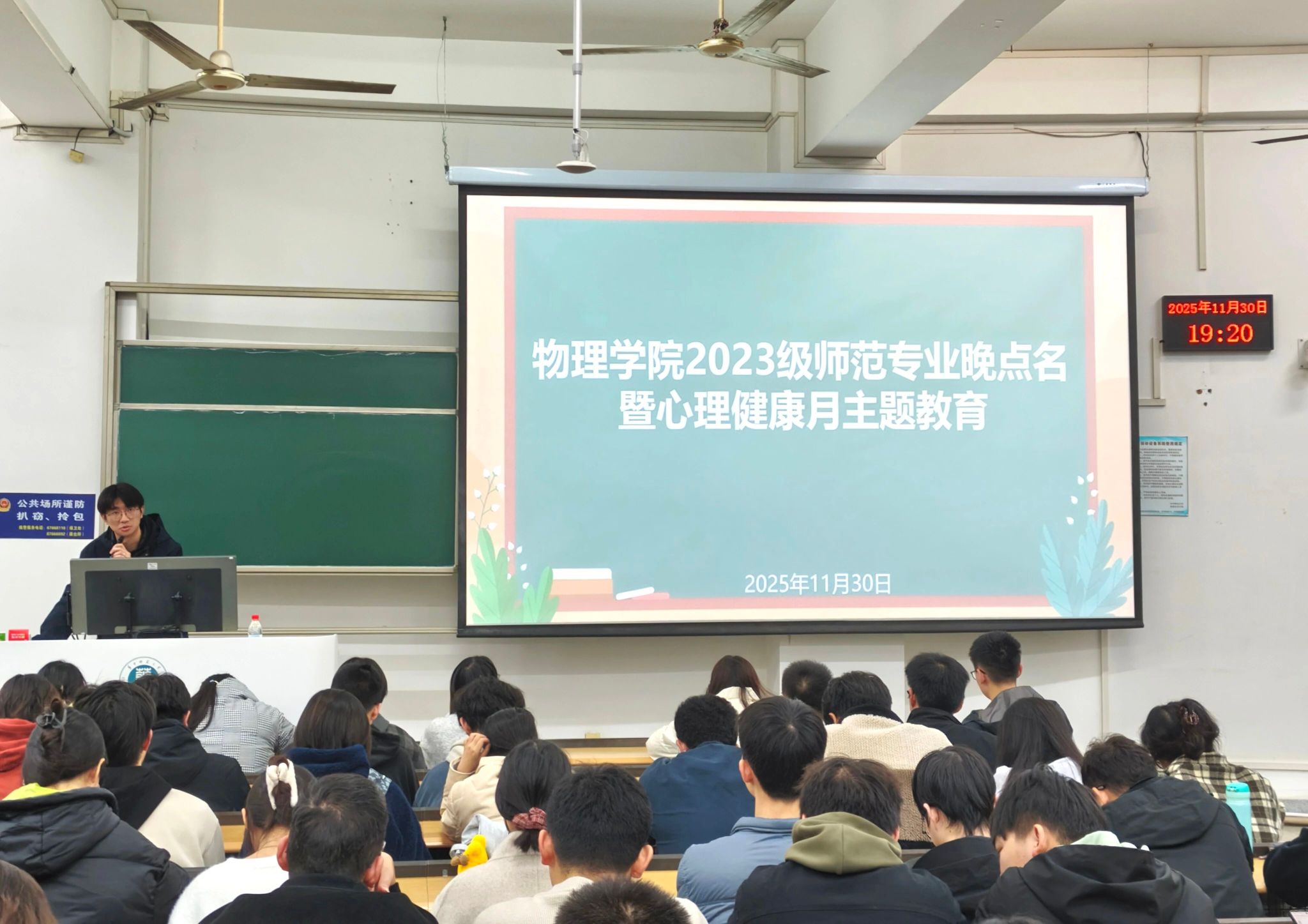 11月30日晚,物理科学与技术学院2023级师范专业在9401教室开展晚点名暨心理健康月主题教育,特邀武汉理工大学心理健康教育中心周树芝老师带来“大学生就业心态调适与行动促进”专题讲座。活动由辅导员王棣主持,全体2023级师范专业学生到场参与,在互动交流中破解求职困惑,筑牢心理防线。