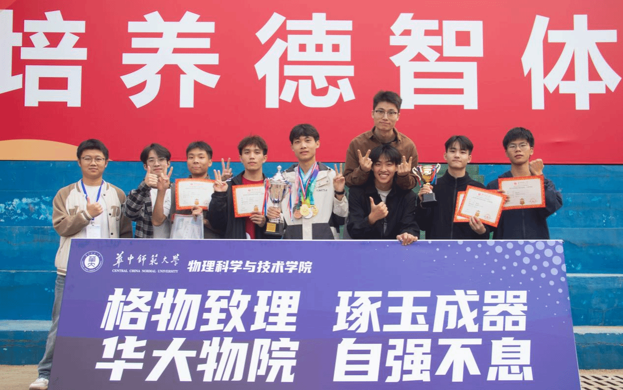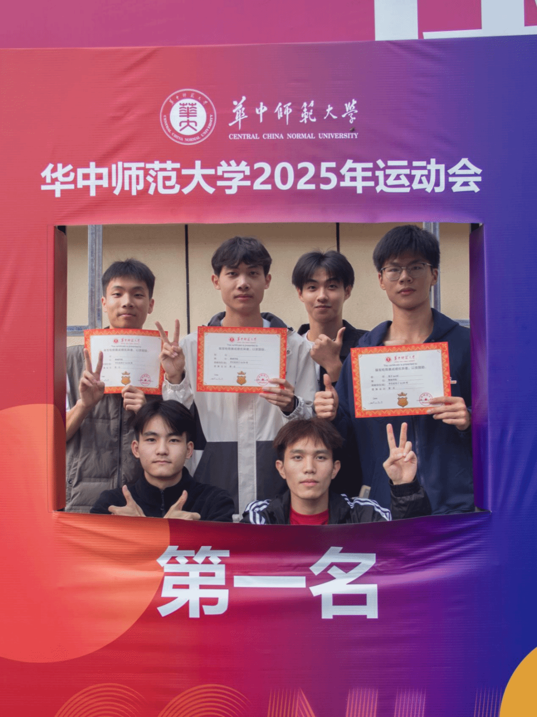 11月1日,华中师范大学2025年校运会迎来男子4x100接力赛,物理科学与技术学院(以下简称“物院”)的杨李佳乐、毛旭翔、邹沛根、王豪圻和文弘辉组队参赛,凭借默契配合与强劲实力,在赛场上奋勇拼搏,最终斩获冠军。