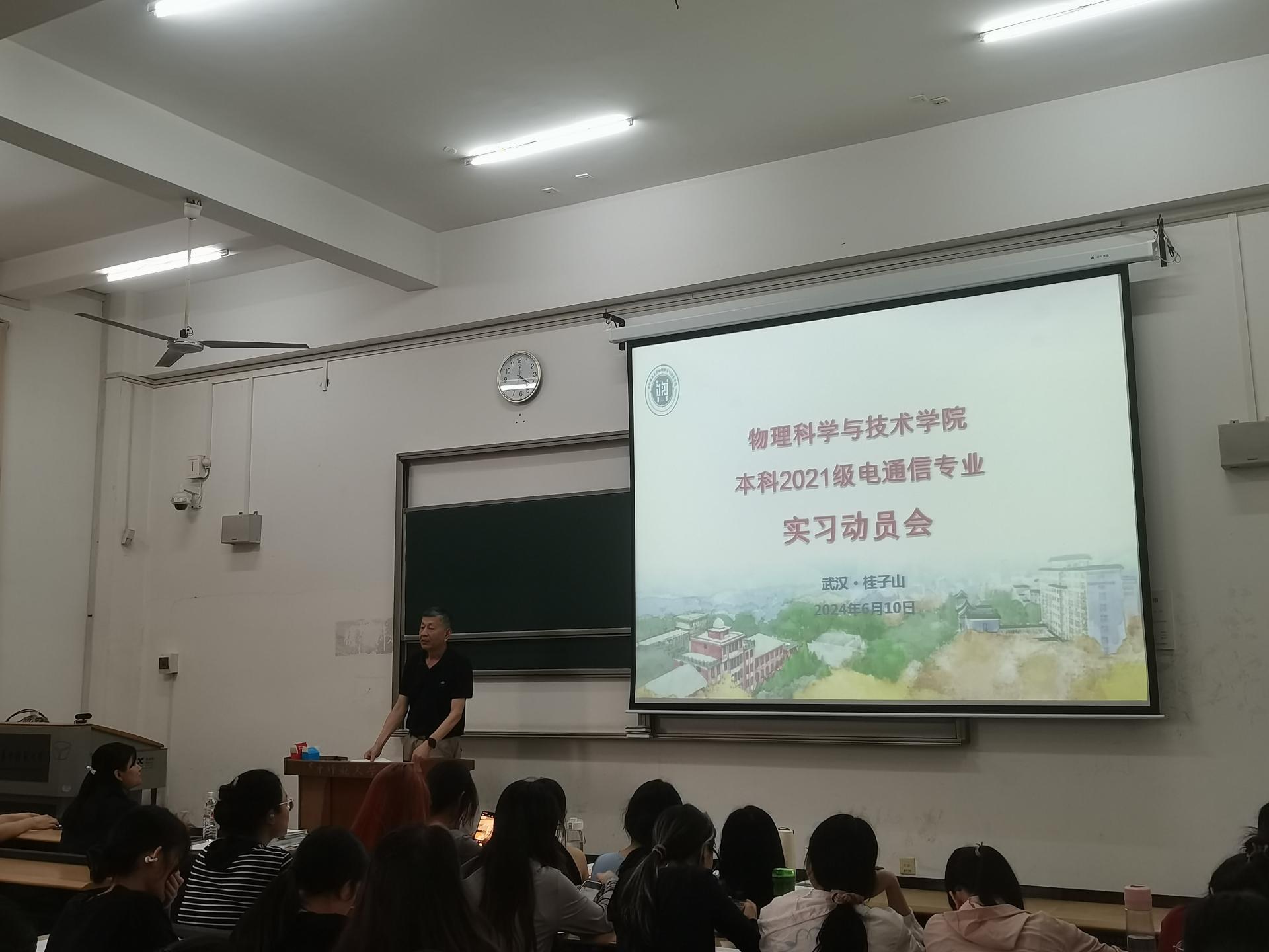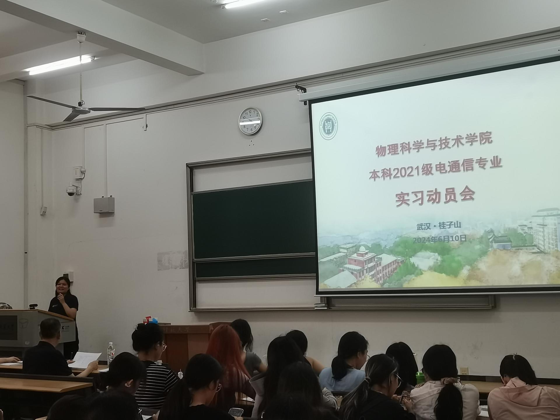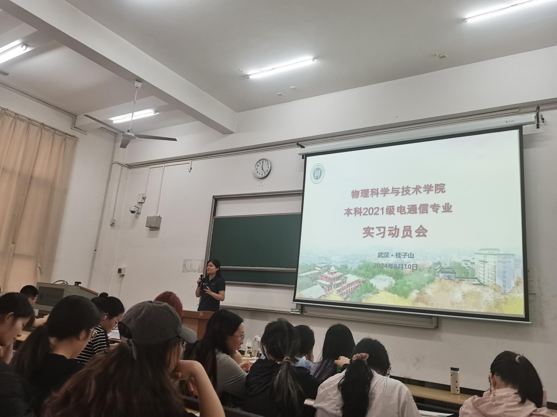 610日下午4时,物理科学与技术学院2021级电通信专业本科生实习动员会在9号楼9402教室举行。本次会议旨在为学生即将到来的实习之旅做好充分准备,明确实习目标,强调实习纪律,并提升同学们对实习重要性的认识。学院实习工作指导老师叶仁泽出席,电通信专业全体本科生参加了此次会议,会议由辅导员刘琦主持。