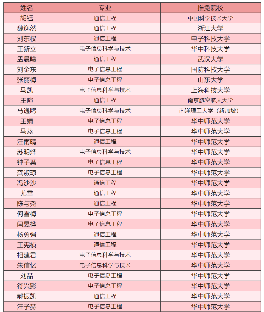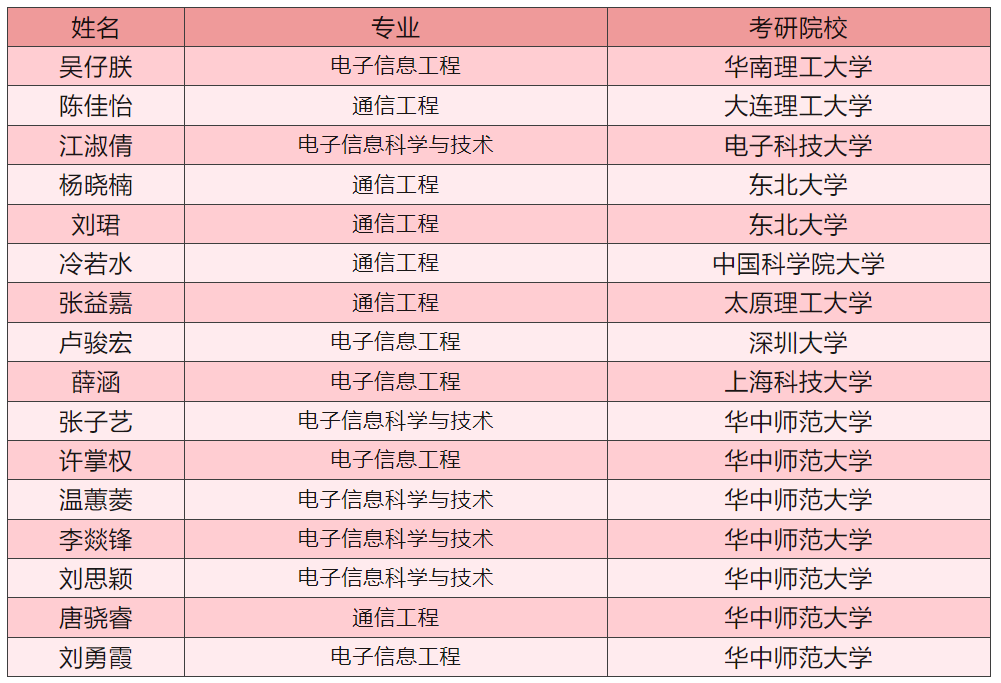 玉汝于成,载誉而归。伴随着学校2024届毕业典礼的举行,桂子山又送走了一大批优秀毕业生。今年,物理学院2024届电通信专业本科生毕业生在升学方面取得优异成绩。截至目前,2024届电通信专业100人中共45名同学成功录取为硕士研究生,其中推免升学28人,考研升学16人,境外升学1人。录取院校分别为浙江大学、中国科学技术大学、华中科技大学、武汉大学、山东大学、电子科技大学、国防科技大学、南京航空航天大学等知名院校。