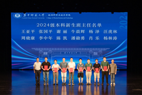 党委书记金新利与副院长吴少平为全体2024级班主任颁发聘书。物理学国家拔尖学生培养基地班班主任王亚平,师范专业班主任张国平、牛晨辉、汪虎林、周晓康,电通信专业班主任李中年、肖乐、杨林涛等老师上台接受聘书并合影留念。