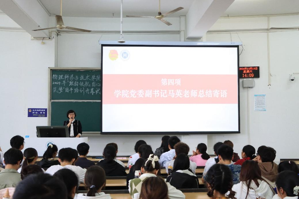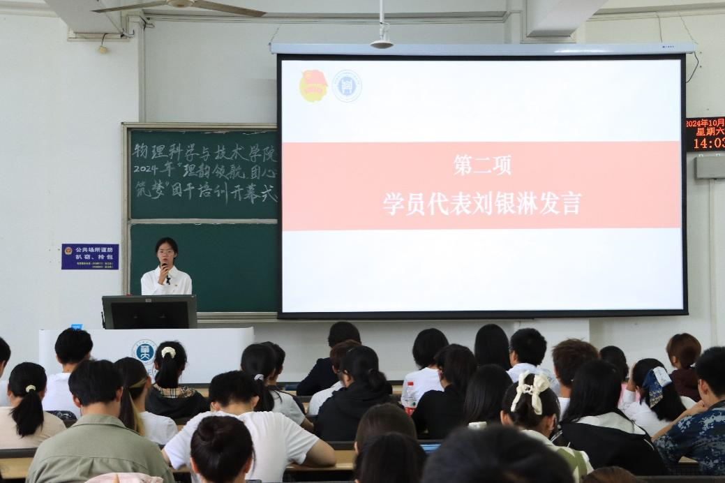 10月19日下午,物理科学与技术学院2024年“理韵领航,团心筑梦”团干培训开班仪式暨素质拓展活动在9401教室及高职体育场举行。学院党委副书记马英和团委书记刘瑾芮参加开班仪式,仪式由学院学生团委副书记孙盈盈主持。此次活动旨在提升学院团学干部的综合素质与团队协作能力,进一步激发团学骨干的青春活力与工作热情。