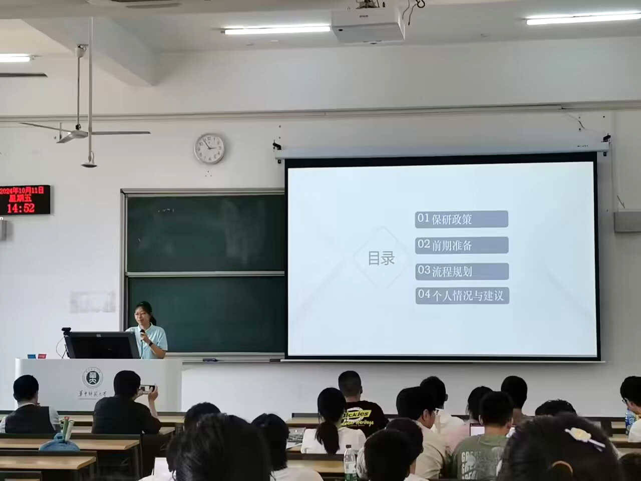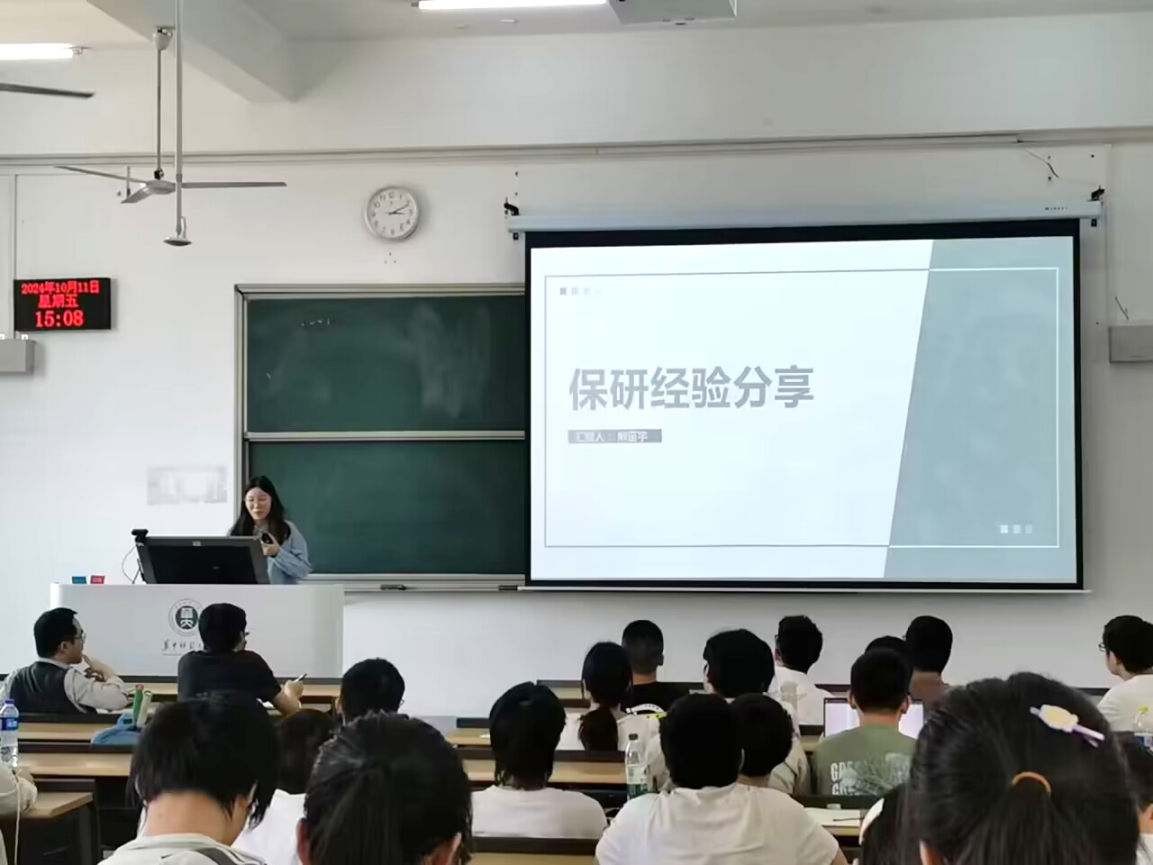 接着,2021级基地班梅雪仑从四个方面分享了她的保研经验,了解相关学校政策、确定发展方向、学好专业课程、提前做好面试等。梅雪仑着重强调了确定自身目标以及专业研究方向选择的关联度,鼓励同学们早做准备,注重平时的学术积累。