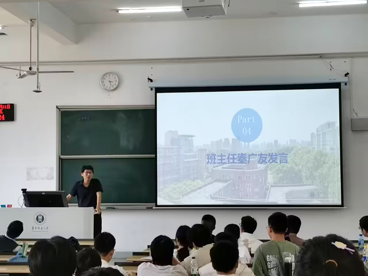 经验分享环节结束后,2023级基地班班主任秦广友发言。秦老师对同学们的学习态度和成绩表示肯定,并提出了新学期的期望。他从基地班人才培养定位、未来人生规划以及学习生活等方面向同学们提出建议,希望同学们能够继续保持学习的热情,同时也要注意身心健康,全面发展。