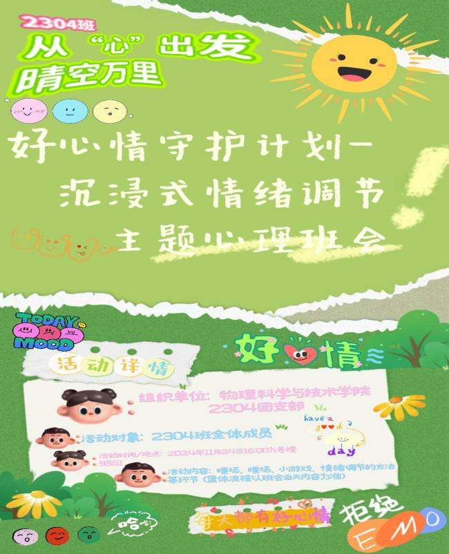11月24日下午,物理科学与技术学院2304班的同学们迎来了一场别开生面的心理班会——“好心情守护计划”!这可不是一场普通的班会哦,而是一场沉浸式的情绪调节盛宴,让我们一起来回顾那些精彩瞬间吧!本次主题班会由2304心理委员姚鑫怡主持,辅导员王棣出席,2304班全体同学参加。