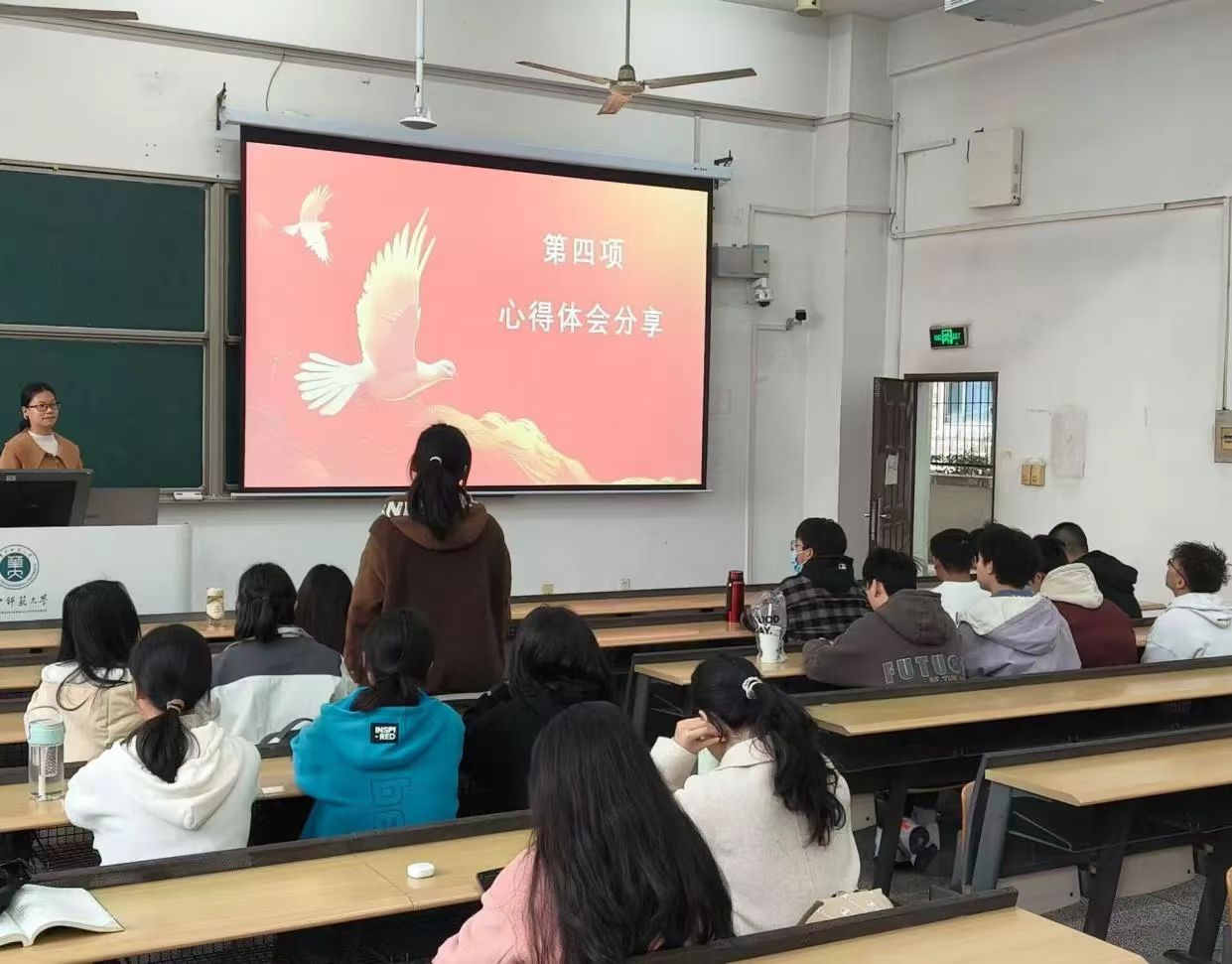 活动中,借助照片等资料,同学们回顾了当日上午举办的第三十二届“创新杯”科学文化节活动,2402班部分成员参与了该活动的志愿工作。丁菲娅鼓励同学们踊跃参与志愿服务,在实践中学习成长。