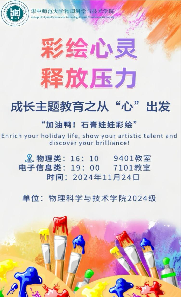 11月24日,物理科学与技术学院2024级于9401、7101教室开展“从‘心’出发”大学生成长主题教育活动,通过石膏娃娃彩绘与心得分享,助力学生放松身心、释放压力,同时培养大家的积极心态与求助能力。活动由2024级生活兼心理部部长马清华、主席团成员刘琪主持,辅导员舒佳欣、余思齐指导。