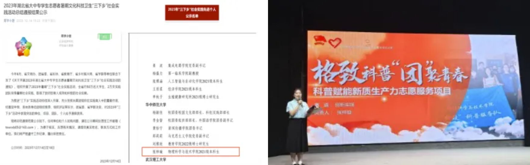 她积极参与科普服务、社区实践等多项志愿服务活动,累计志愿服务时长255小时,获评2023年省暑期“三下乡”大中专学生社会实践活动先进个人,连续两年获评校“优秀志愿者”荣誉称号。所在团队荣获全国科技志愿服务示范团队、湖北省本禹志愿服务队、湖北省大学生社区实践计划优秀工作单位等国家级荣誉三项、省级荣誉两项。