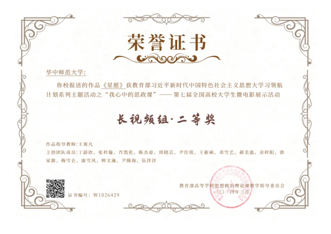 党性是共产党员立身、立业、立言、立德的基石。作为共产党员,张梓璇按时参加党课学习、加深自身理论修养。而作为一名合格共产党员,不仅仅要提升自身的党性修养,更要进一步宣传党的有关知识和理论,用自己的行动践行党的思想。为进一步学习和弘扬党的先进思想理论,她积极参与各项理论学习活动,参与习近平新时代中国特色社会主义思想大学生领航系列主题活动之“我心中的思政课”比赛,为项目组撰写剧本,项目荣获长视频组国家级二等奖。