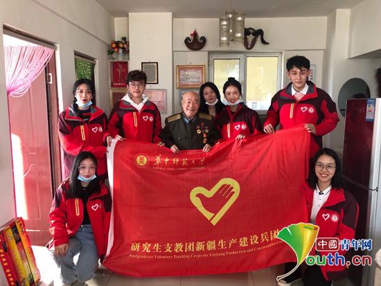 华中师大研支团兵团分队成员与军垦老兵张建铎老人合影。林诗芸 供图