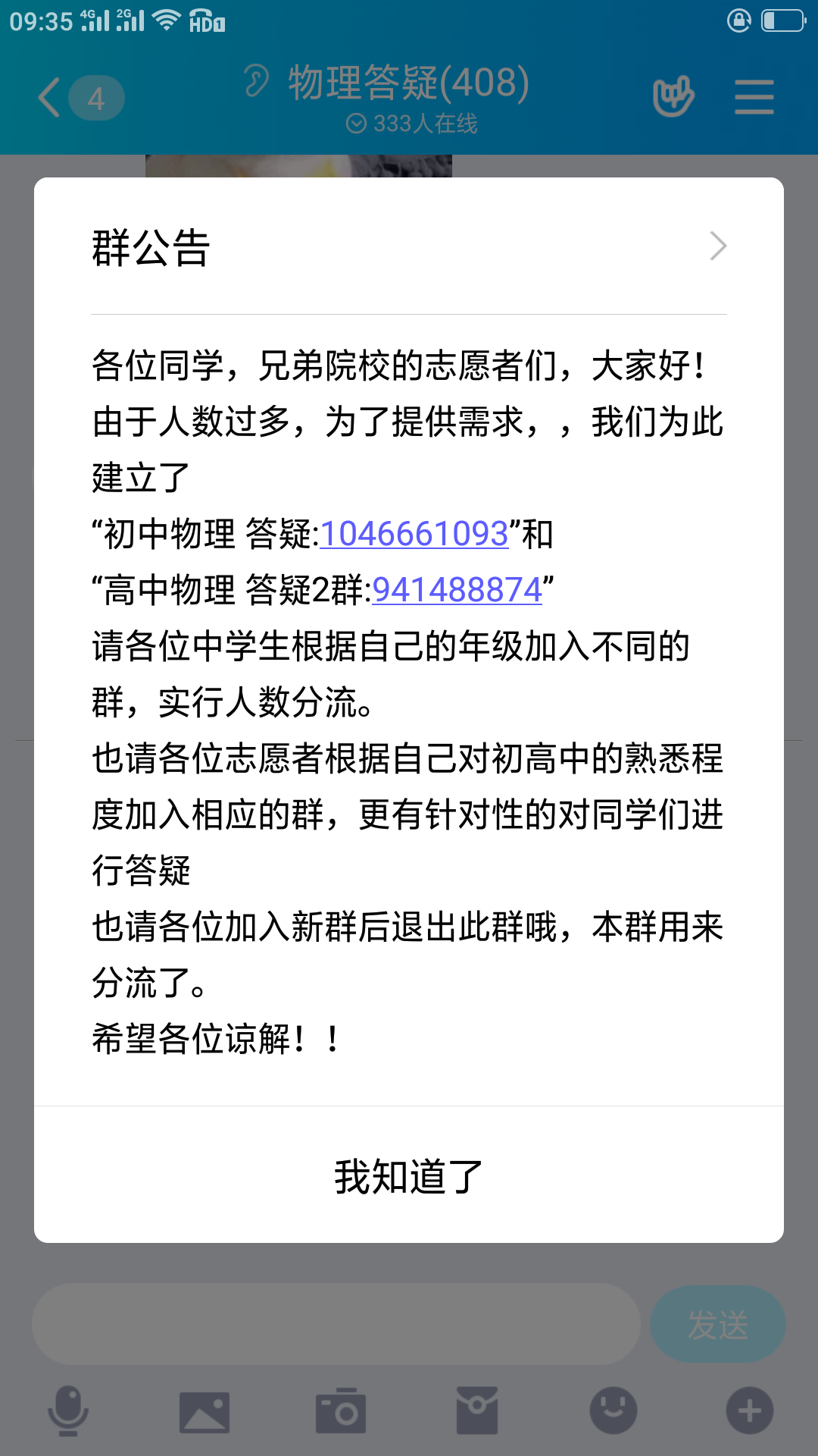 活动一经发起,便得到了华中师范大学与各大兄弟院校物理相关专业志愿者们的积极响应。截止到目前为止,已经建立四个答疑QQ群,分别为用来分流的“物理答疑”以及三个用来答疑的“初中物理答疑”和“高中物理答疑”、“高中物理答疑2群”QQ群。群内汇聚了来自湖北、山东、广西、福建等20多个省市的近千余名学生与志愿者。
