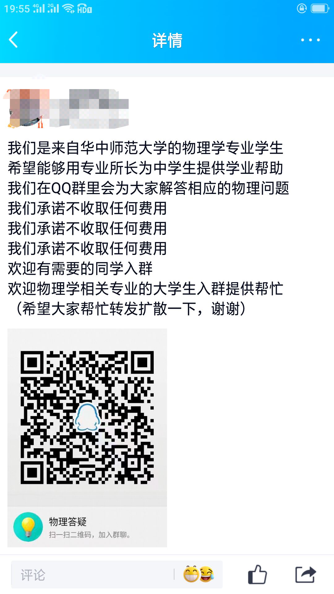 (通讯员:张晔)疫情无情人有情。2020年2月8日,物理科学与技术学院2016级物理师范专业的黄信安、周文同学发起QQ群线上答疑活动,该活动以辅导疫情严重的湖北省中学生物理学习为主,面向全国中学生,免费为同学们进行线上物理答疑。