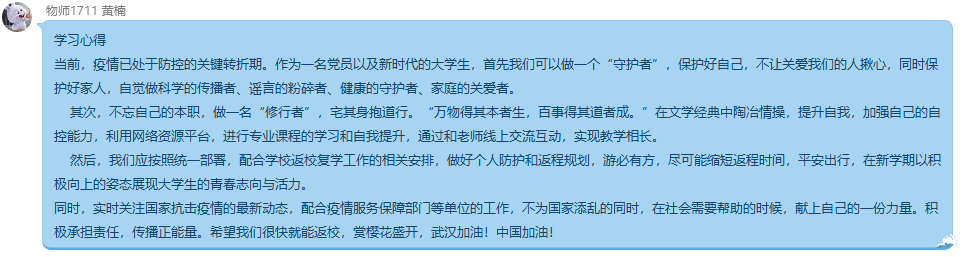 接下来,各位同志通过语音和文字形式发表自己的学习心得及思考感想。2017级师范专业张婧同学分享了自己的三点思考,一是强调责任意识的重要性,要有大局意识,按照规定居家隔离;二是做好宣传工作,不信谣不传谣,在能力范围内进行辟谣或撰写文稿、拍摄视频,帮助公众坚定信心;三是提高办事效率和时间观念,加强自控能力,调节心理状态,不给工作者添负担、不给其他人添麻烦。此外,她还分享了作为党员的姨妈,在卫计办工作一线抗击疫情的故事。2017级基地班杨悦同学分享了母亲作为医护人员奋战在抗疫一线的故事,她动容地讲道“我与母亲已经24天没有见面了”,作为孩子的她曾自私地不想母亲“出征”,然而作为老党员的母亲却义无反顾地奔向了前线。