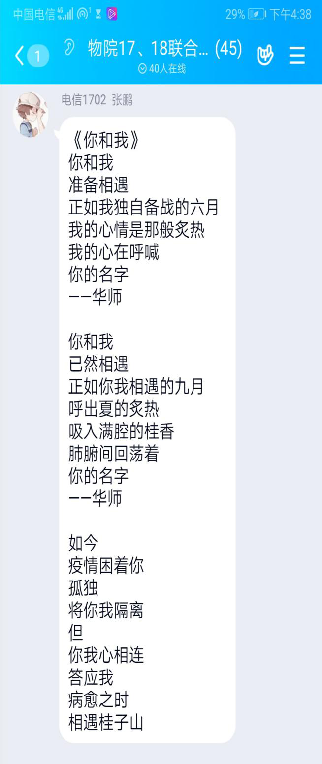 (通讯员 姜梦圆、张婧)2月23日下午,物理学院本科生2017级、2018级联合党支部以线上语音通话的形式开展2月份主题党日活动,本次活动结合前期自学情况,主要围绕学习习近平总书记关于新冠肺炎疫情防控工作的系列重要讲话和重要指示批示精神、学生党员如何为抗“疫”工作做贡献展开讨论,活动最后以“分享爱上华师、爱上武汉的一个理由”为话题表达对武汉、对华师的思念和祝福。党支部全体45名师生党员参加,活动由党支部书记淦丽霞和组织委员张文杰主持。