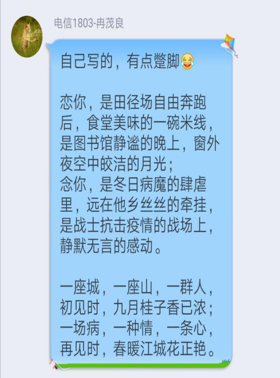 活动最后,支部成员以“爱武汉、爱华师的一个理由”为话题,用多种形式表达对武汉、对华师的思念和牵挂。曲桐、张鹏和冉茂良以原创诗歌寄真情;王雯婕、吴静涵剪辑视频,为武汉加油。从长江大桥到樱花银杏,从图书馆到桂香园,武汉的进取与包容,华师的教诲和关怀,大家都格外想念,纷纷表达了想要回到武汉生活、回到校园学习的强烈愿望,同时表达了对武汉的祝福和对战胜疫情的坚定信心。