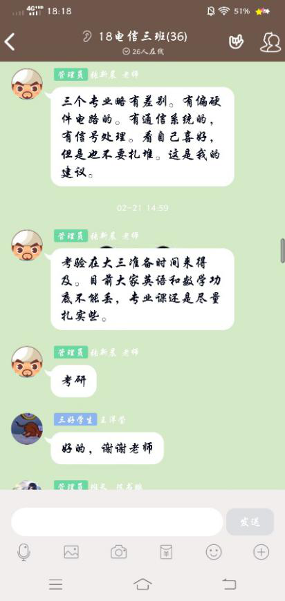 针对电子信息类的同学们即将面临的专业分流问题, 1803班班主任张新晨老师通过线上班会跟同学们详细分析了分流后的三个专业的学习、就业和发展情况,提醒同学们在分流前多跟家人、老师、学长学姐们沟通,做好充分的思考。此外,张老师还叮嘱同学们要继续做好自己和家人的防控工作,保持平和的心态,多喝水、多锻炼。1813班班主任邱明老师和班主任助理鲍从发介绍了本专业保研、考研和就业的相关情况,鼓励大家及早树立目标并朝着目标方向不断努力。