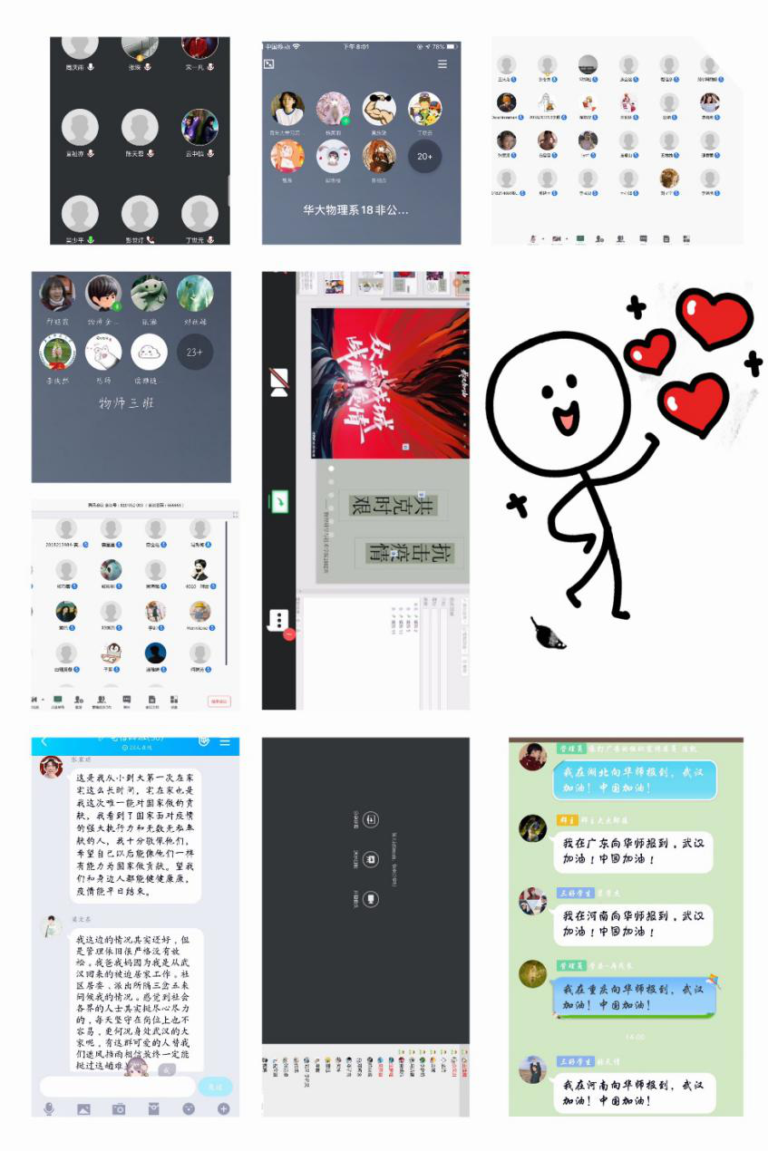 在这个特殊的时期,物理科学与技术学院2018级的班主任们通过各种线上方式将班里的同学们凝聚在一起,给予同学们指导和关爱。希望同学们珍惜光阴,珍惜与老师们、同学们的相遇与相聚,在做好疫情防控工作的同时努力学习,待疫情结束后,我们桂子山见!