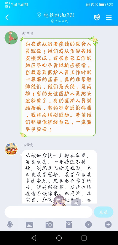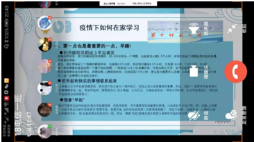 部分同学反映网络课堂学习难度大、效率低,针对这种情况,在班主任徐俊的指导下,1807班就“疫情防控期如何更有效进行学习”主题进行了探讨,何玉玺同学分享在家解决“拖延症”提高效率的方法。1809班班主任杨书华结合自己的教学经历向同学们分享了在线学习的方法和技巧,同时鼓励同学们加强体育锻炼、帮助家人做家务。