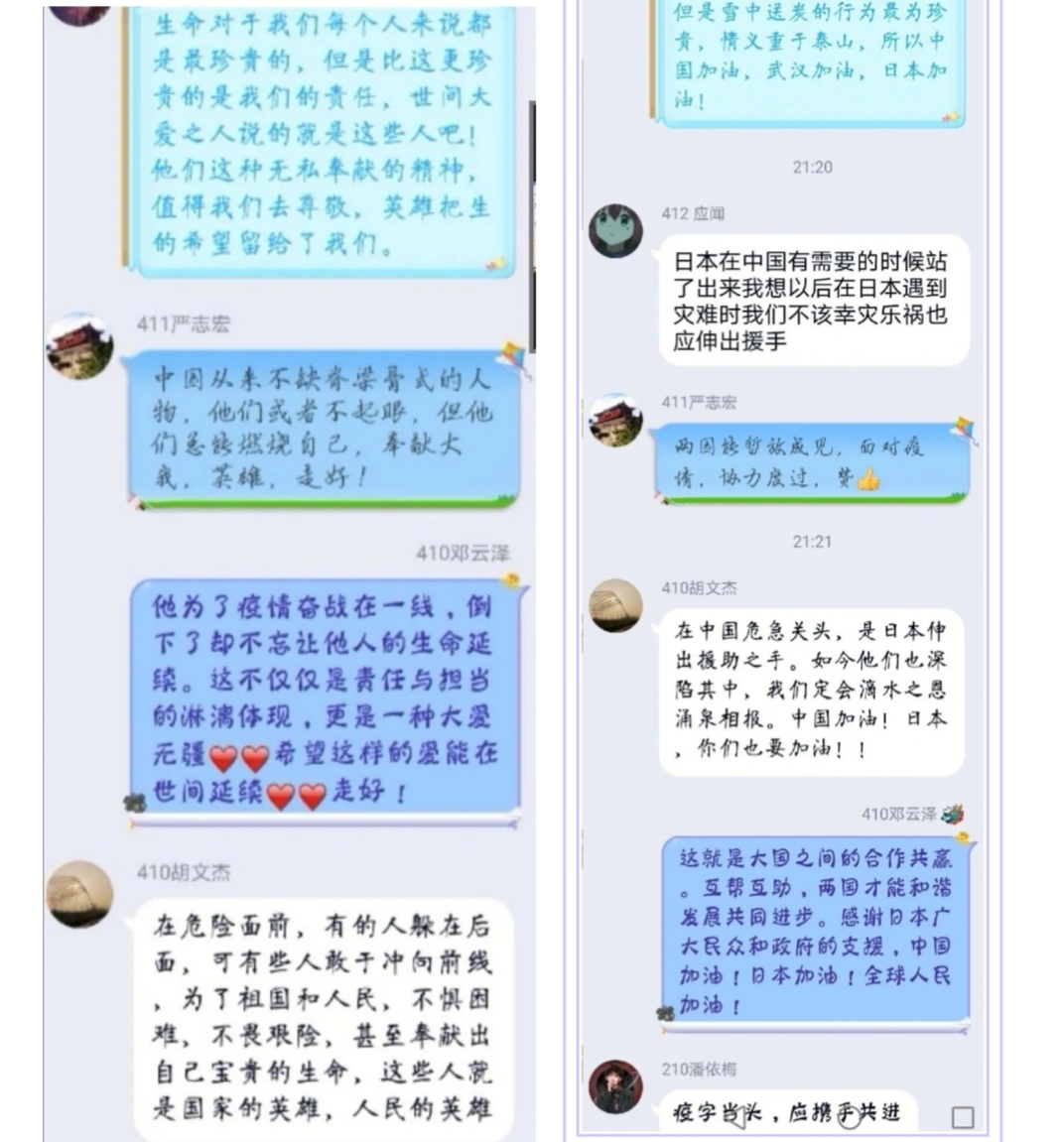 物理科学与技术学院1906团支部,在班主任乔翠兰的组织下,针对居家隔离,做好防控工作进行了线上交流,分享了身边社区志愿者与一线工作人员事迹。刘辰妤、赵榕两位同学的家长一直奋战在抗疫一线,乔翠兰老师参加了社区的志愿者,这种辛勤付出、无私帮助的精神感动着同学们、鼓舞着同学们,大家对战胜疫情充满了信心。