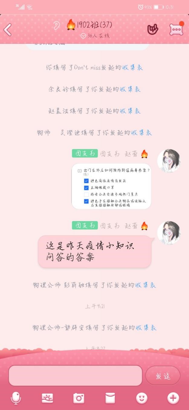支部以团支书赵蕾为核心,由王力伟等六名班级委员组成防疫宣传指导小组,积极在线上开展防疫知识科普活动,填写支部成员健康状况调查表,推送防疫小贴士和学习打卡活动。