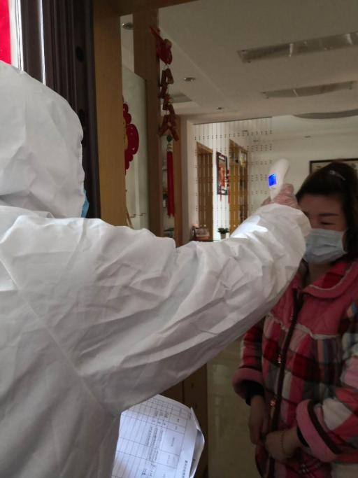 杨鸿加入社区志愿者队伍,开展社区防疫工作。穿着防护服逐个上门测量体温,登记居民健康状况,讲解防疫工作进展情况,并宣传普及科学防疫知识,得到了居民的支持和理解,为居民做好自我防护提供了保障。