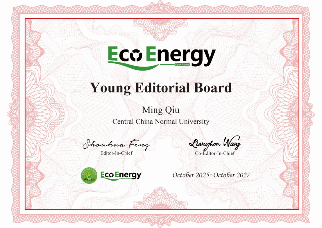 近日,我院邱明教授获邀担任 Wiley 出版集团旗下期刊《EcoEnergy》青年编委。《EcoEnergy》是Wiley出版集团和中国化学品安全协会最新打造的一本同行评议、跨学科、高质量、快速出版的旗舰期刊,由中国科学院院士、吉林大学冯守华教授与欧洲科学院院士、香港理工大学王连洲教授共同担任创刊主编。