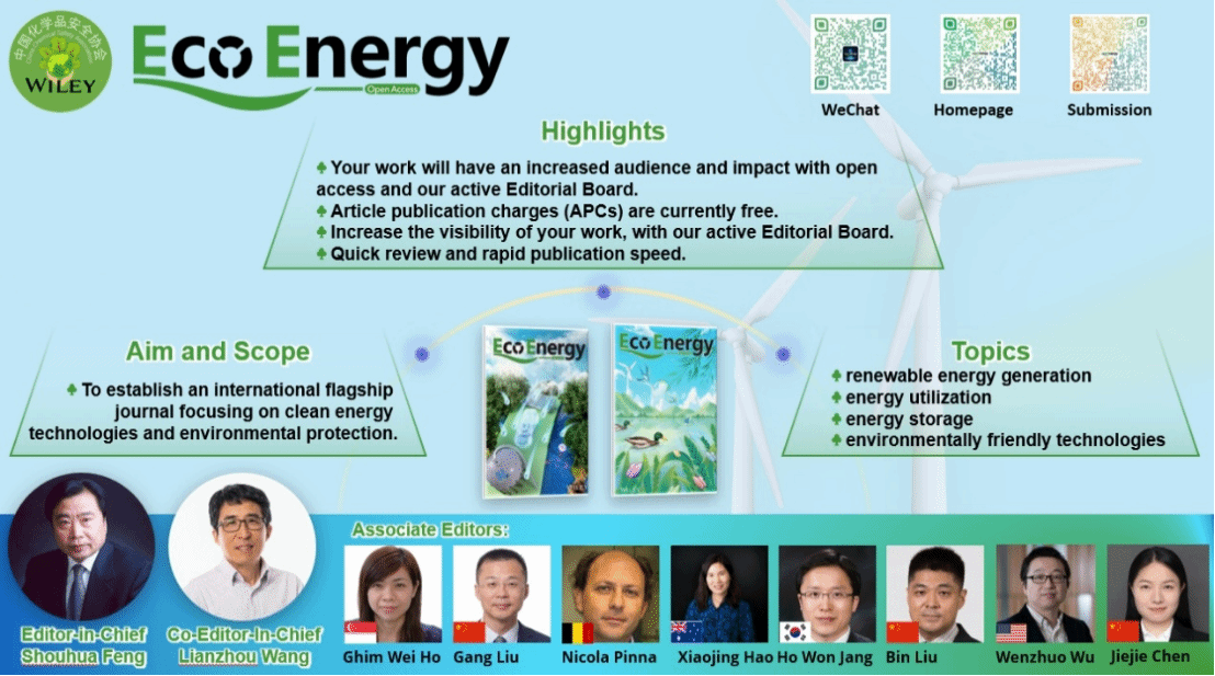 《EcoEnergy》期刊依托Wiley出版集团和中国化学品安全协会为绿色能源领域相关科研工作者提供一个国际性的交流平台,发表生态能源领域的原创性研究成果,包括可再生能源发电、能源存储、能源利用和能源相关的环保技术等。发表文章包括研究论文、综述、展望、评论等类型。