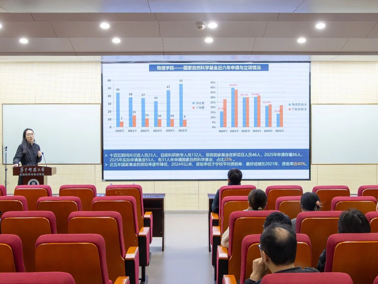 为系统总结“十四五”期间学院科研工作成效,精准把握国家自然科学基金申报最新动态,科学规划“十五五”时期科研发展路径,12月24日,学院于九号楼9557报告厅举行科技处国家自然科学基金指导与动员会。会议特邀学校科技处副处长徐芬莅临指导,物理学院副院长赵蕴杰、各科研团队负责人、中青年骨干教师及博士后代表参加会议。