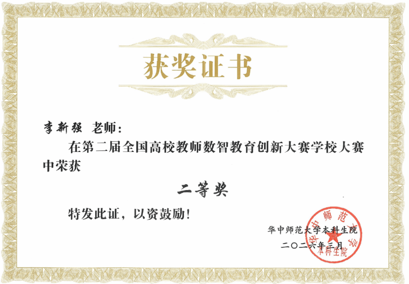 近日,高校教师数智教育创新大赛学校大赛获奖结果公布,我院李新强老师凭借出色的数智化教学创新成果,荣获校级二等奖,并推荐参加第二届全国高校教师数智教育创新大赛。