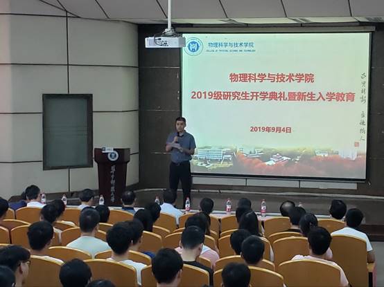 (通讯员 范良辰 刘沛泽)9月4日下午,物理科学与技术学院2019级研究生开学典礼暨新生入学教育在九号楼一楼报告厅顺利举行。学院党委书记张明生、院长张本威、党委副书记曹阳、副院长俞云伟、副院长黄光明、各学科负责人及部分教师代表出席。学院2019级全体研究生参加。典礼由学院党委副书记曹阳主持。