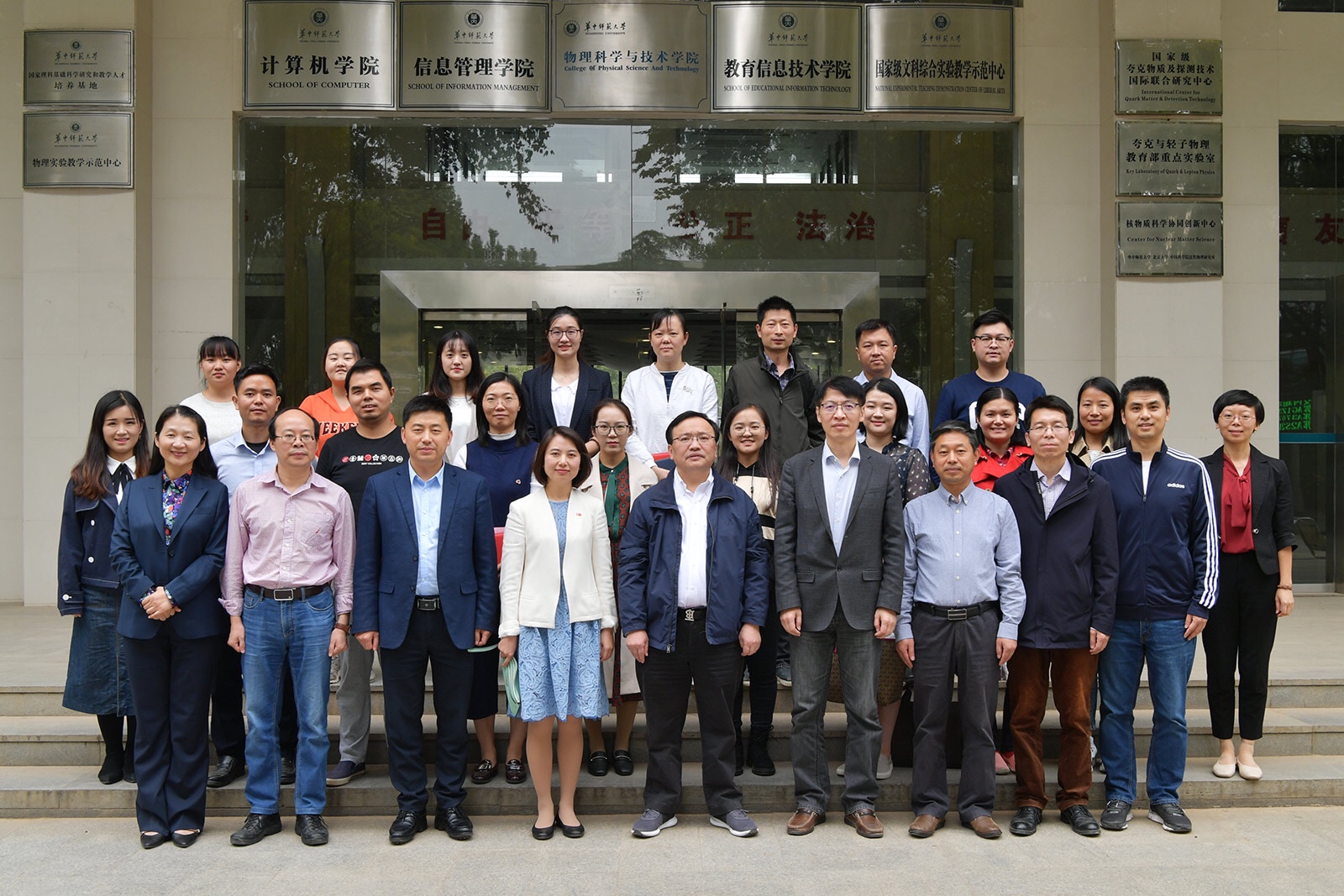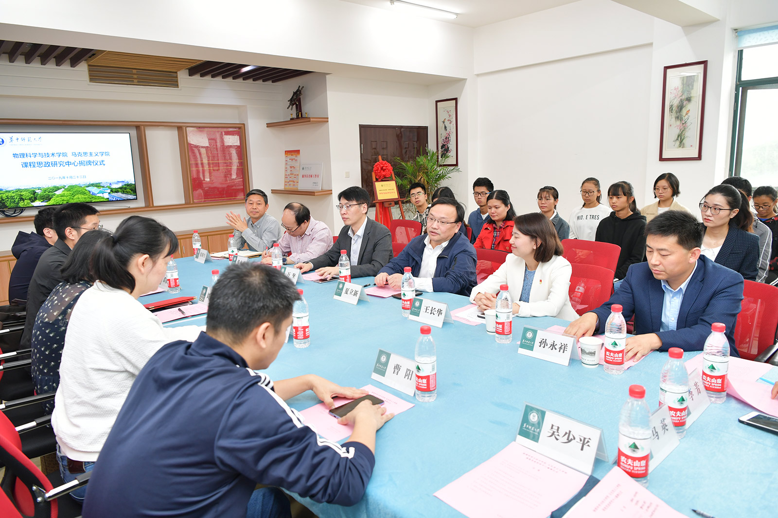为深入贯彻落实习近平新时代中国特色社会主义思想和党的十九大精神,进一步学习贯彻习近平总书记在全国教育大会、全国高校思想政治工作会议重要讲话精神,全面推进由“思政课程”向“课程思政”的教育教学改革,10月22日上午,物理科学与技术学院、马克思主义学院课程思政研究中心揭牌仪式在九号楼9551举行。副校长夏立新出席,党委宣传部部长王长华、本科生院院长万坚、马克思主义学院分党委书记孙永祥、物理科学与技术学院分党委书记张明生及院长张本威与会。马克思主义学院、物理科学与技术学院党政班子成员,首批参加课程思政研究中心的教师,物理科学与技术学院的全体专兼职辅导员及学生代表参加会议。会议由物理科学与技术学院分党委副书记马英主持。