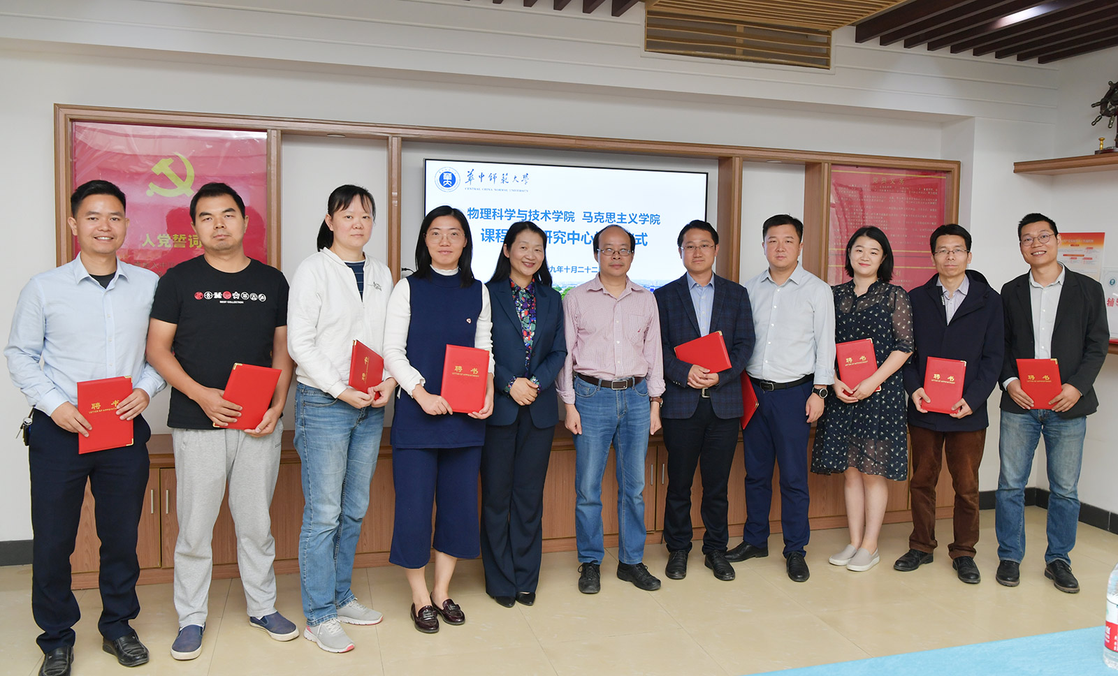 校党委宣传部部长王长华、本科生院院长万坚、物理科学与技术学院院长张本威和马克思主义学院分党委书记孙永祥为课程思政研究中心揭牌。两院领导为马克思主义学院王世鹏、物理科学与技术学院邓为柄等11位首批研究中心成员颁发聘书。