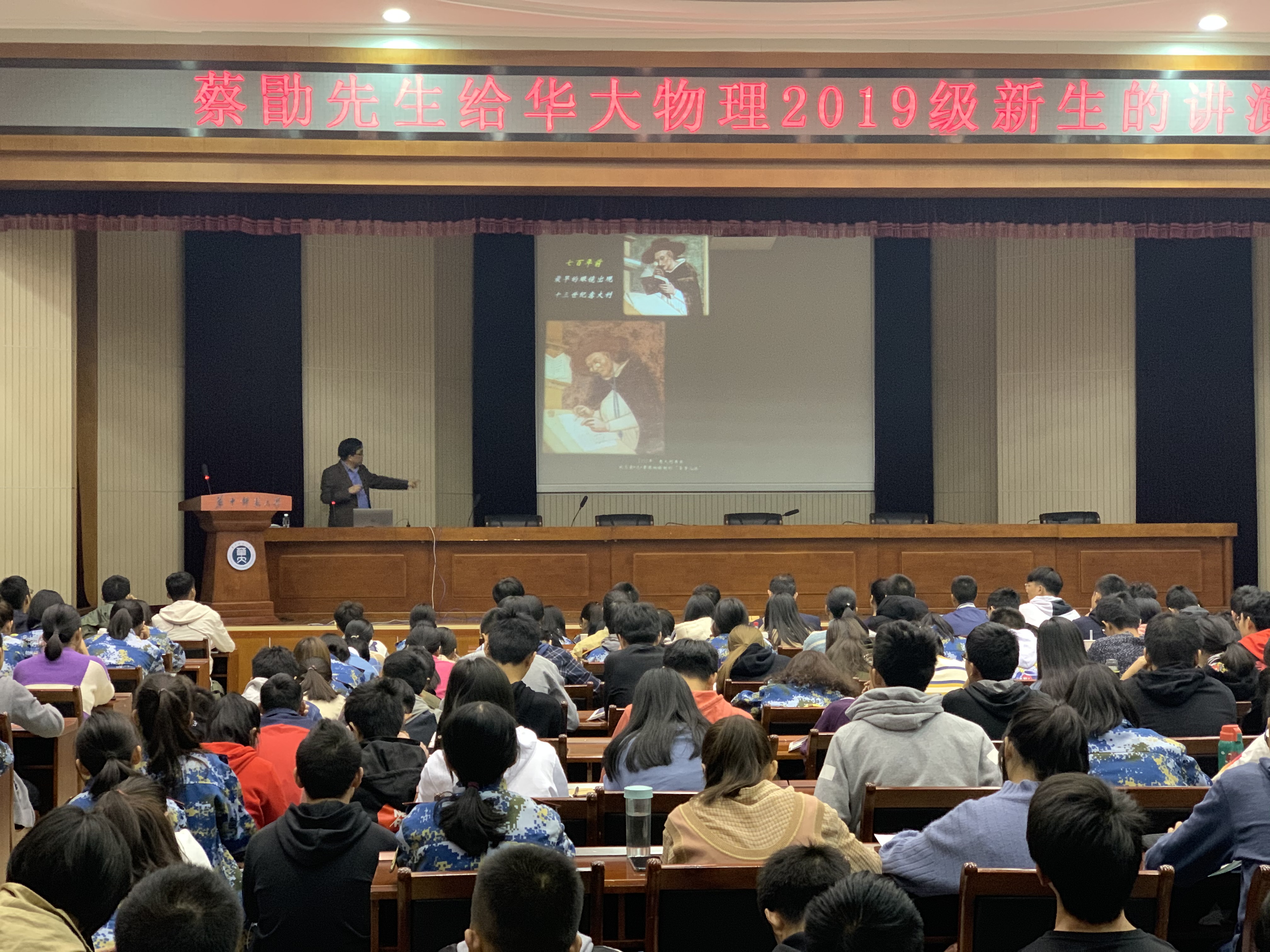 蔡教授以2019年诺贝尔物理奖拉开了讲演的序幕,他用学物理、教物理和做物理三个词组表明他对物理的态度。紧接着,他强调学会“问物理”是做好这三项的基础。在他看来,人和动物的区别就是人会用眼睛观察世界,然后对世界的运行规律产生疑问并加以探索,由此便产生了科学。随后,蔡教授向同学们介绍了天文物理的发展史。从中国早期用浑仪、简仪和西方用观天堡进行肉眼观天,到显微镜和望远镜的出现,再到惠更斯和牛顿对光的本性之争,蔡勖用鲜活的故事激发了在场学生对天文物理的热情,将演讲推向高潮。
