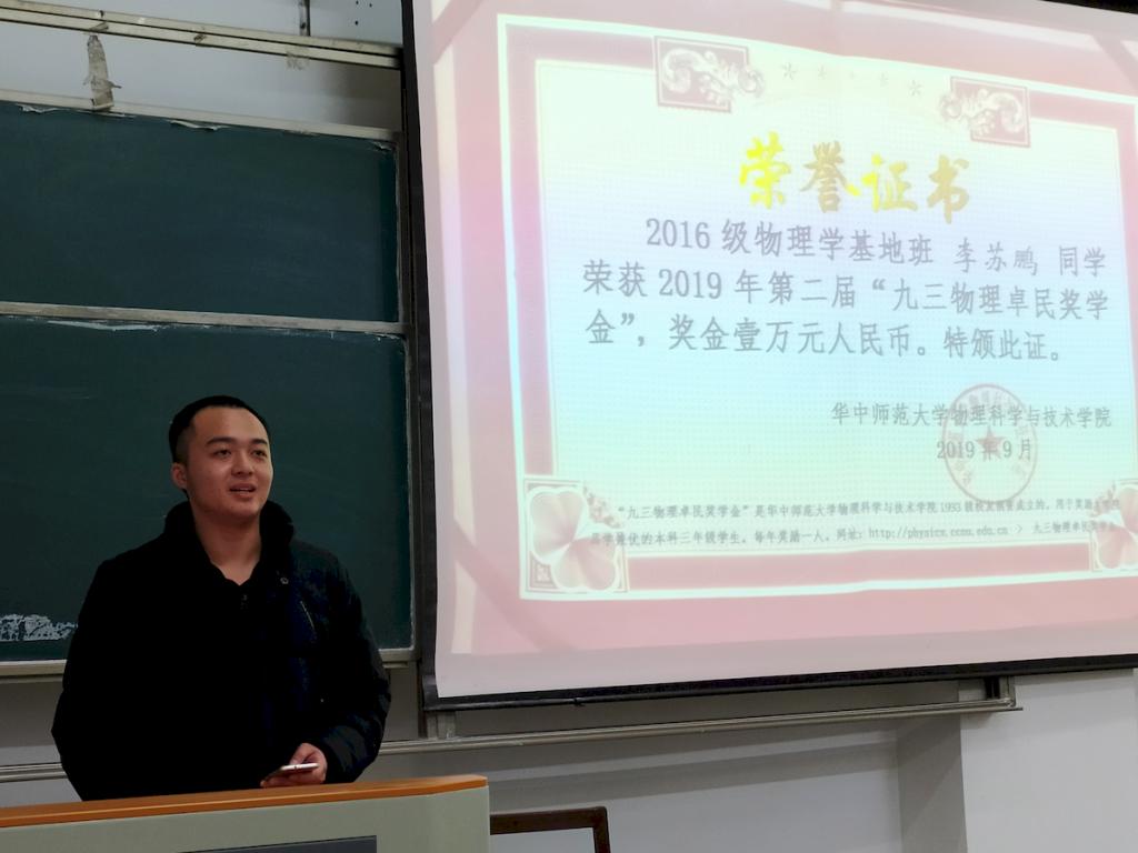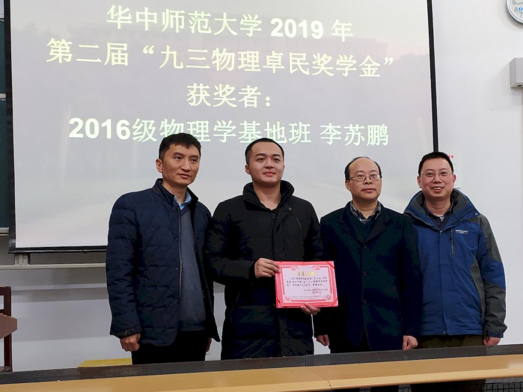 “九三物理卓民奖学金”是由华中师范大学物理系九三级校友于2017年共同出资设立,旨在奖励热爱物理科学、品学兼优的物理学院本科生。“九三物理卓民奖学金”每年评审一次,评审内容为大学本科前五个学期专业课程成绩、科研成果、其它成果以及对物理学的感悟。