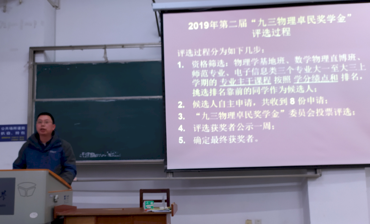接下来李安邦老师作为“九三物理卓民奖学金”委员会秘书为大家详细说明了“九三物理卓民奖学金”的评审流程,通过资格筛选、候选人自主申请、委员会投票评选、评选获奖者公示一周等环节,最终确定了2019年第二届“九三物理卓民奖学金”的获奖者。