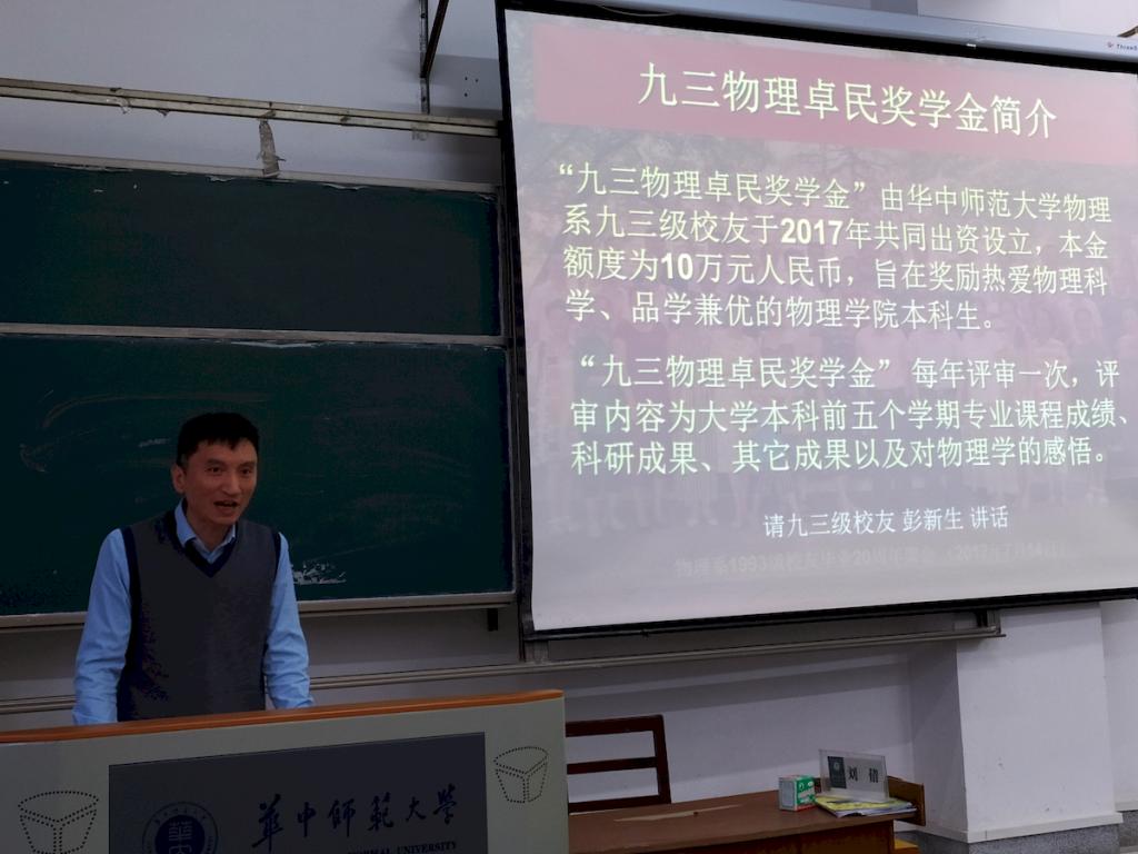 本次颁奖仪式由李安邦老师主持。首先请彭新生先生为大家介绍了关于“九三物理卓民奖学金”的来由。他深情地回顾了二十多年前在华师度过的本科四年、研究生三年的求学生涯和执教一年的教学经历,简介了自己毕业十几年之后的工作经历和人生体会。他说,毕业之后工作这么多年,虽然我们年级的校友并非都是大富大贵,但是我们作为校友始终眷顾着母校的发展,经常考虑着如何回报母校,因此在2017年本年级校友毕业二十周年聚会之际,大家共同积极捐款,创建了“九三物理卓民奖学金”,以奖励优秀的学弟学妹,为物理学院的发展奉献我们的绵薄之力。希望这个奖学金能够长期发展下去,也希望它能作为一个火种,鼓励物理学院的校友为物理学院的发展作出更多支持和帮助。